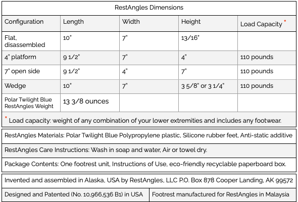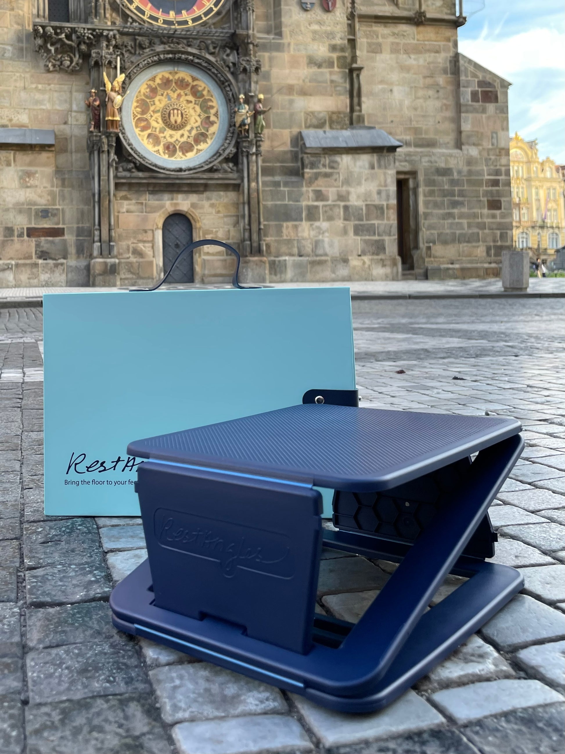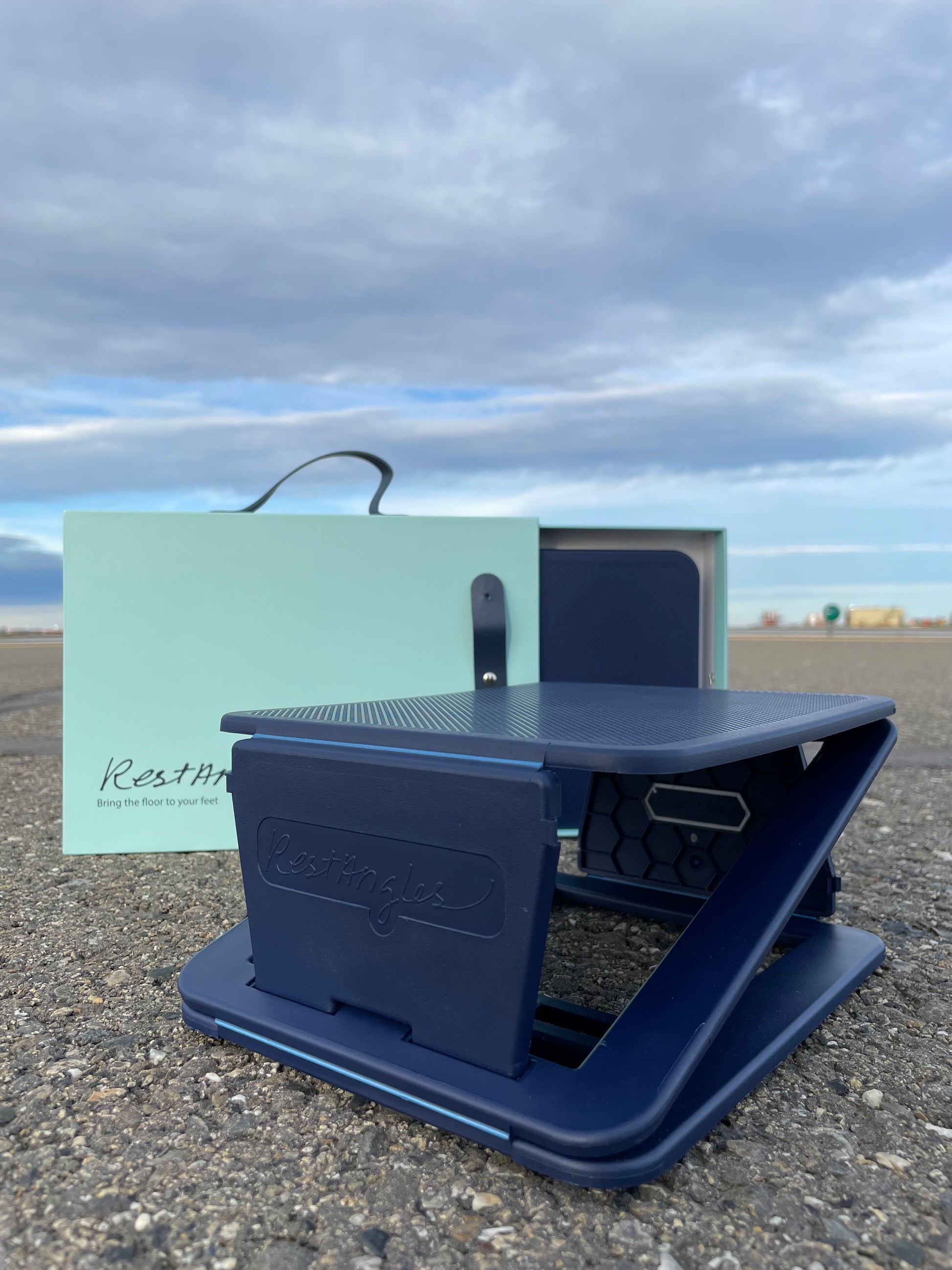 Are you tired of dangling legs while sitting? Look no further! Introducing RestAngles - the portable footrest that brings the floor to your feet. Lightweight, adjustable, and anti-static, RestAngles is the perfect travel accessory and ergonomics tool. Available in Polar Twilight Blue.