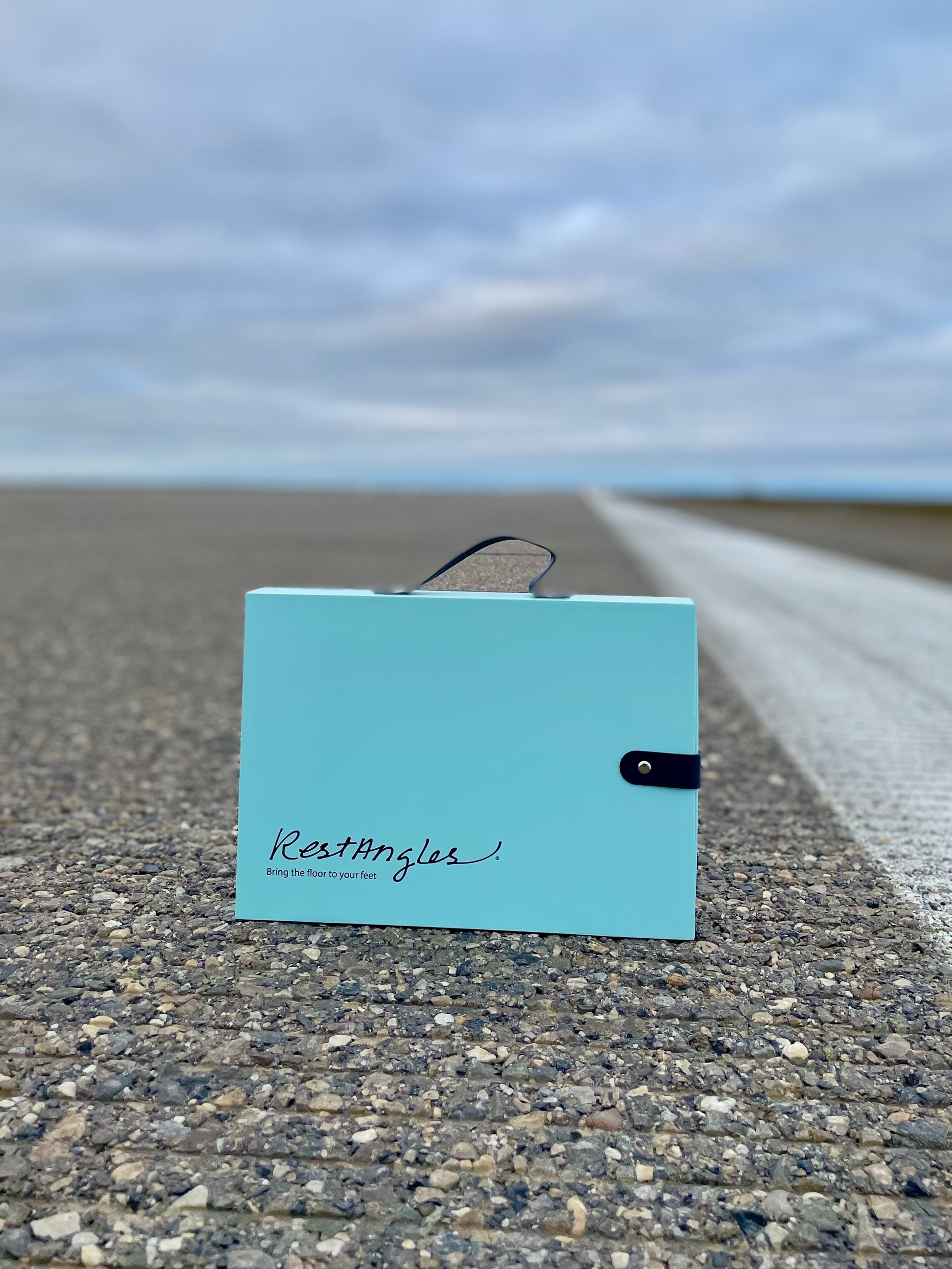 Your RestAngles unit will arrive snuggled inside of an eco-friendly reusable and recyclable paperboard box that looks a bit like a mini-attaché case making transporting RestAngles with you everywhere that much easier. Faux leather handle and clasp! Mint Green and Polar Twilight Blue.